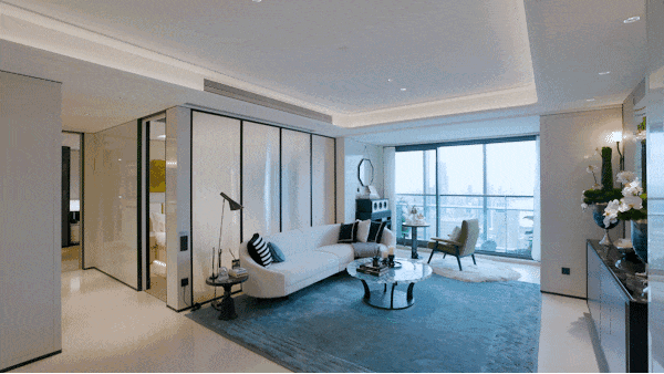 穿过精心设计的过渡空间,大横厅如同一幅缓缓展开的IMAX画卷——陆家嘴三件套在270°转角阳台的框景中,与北外滩浦西第一高楼(在建)形成视觉交响,您会突然理解为何这里被称为"外滩瑞府":因为窗外流动的不仅是风景,更是上海的呼吸。