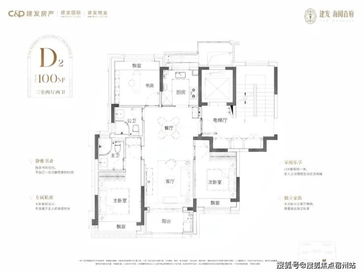 96㎡三房做到了 "3 房 2 卫 + 大横厅" 的高效布局,客厅面宽达 5 米,采光充足且视野开阔,适合年轻三口之家。100㎡三房采用经典的飞机户型,三开间朝南,客餐厅与阳台一体化设计,南北通透,通风效果极佳。