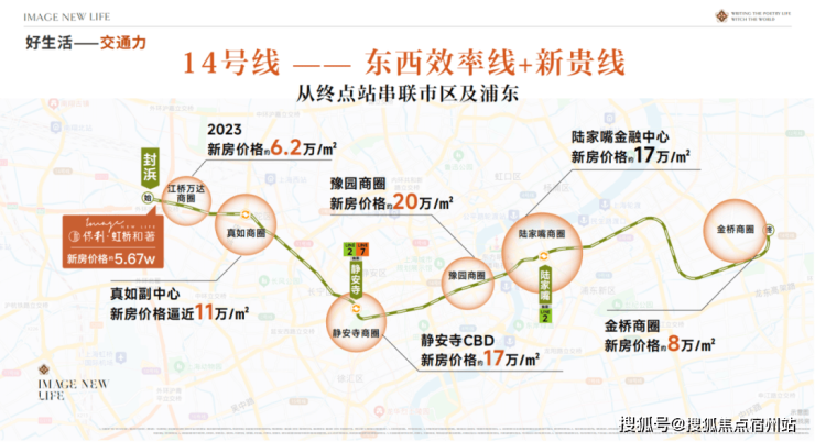 14号线和嘉闵线(在建中)双轨交汇,3站虹桥枢纽,5站普陀,一脉静安。距14号线地铁口仅约200米,步行2分钟即达。作为始发站,通勤有位,30分钟直达静安寺,45分钟抵达陆家嘴。同时相较沿线动辄10万+的房价,本项目“5”字头单价,堪称“外环外的预算,中环级的享受”。