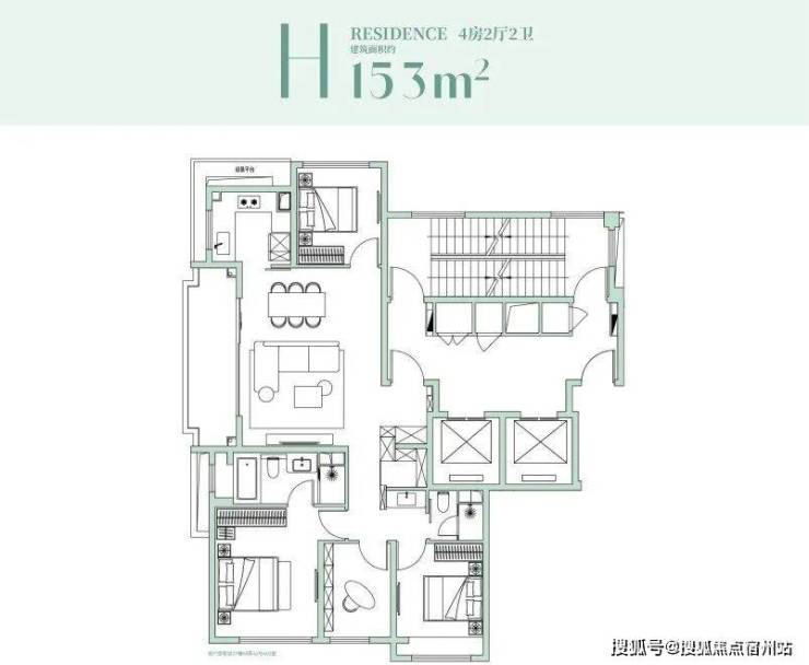 该户型是经典的四叶草布局,四开间分布在四角,兼顾私密与互动,是二胎家庭的优选!