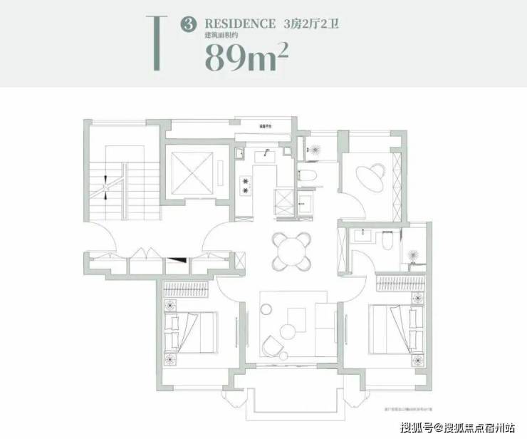 建面约89㎡的三房!