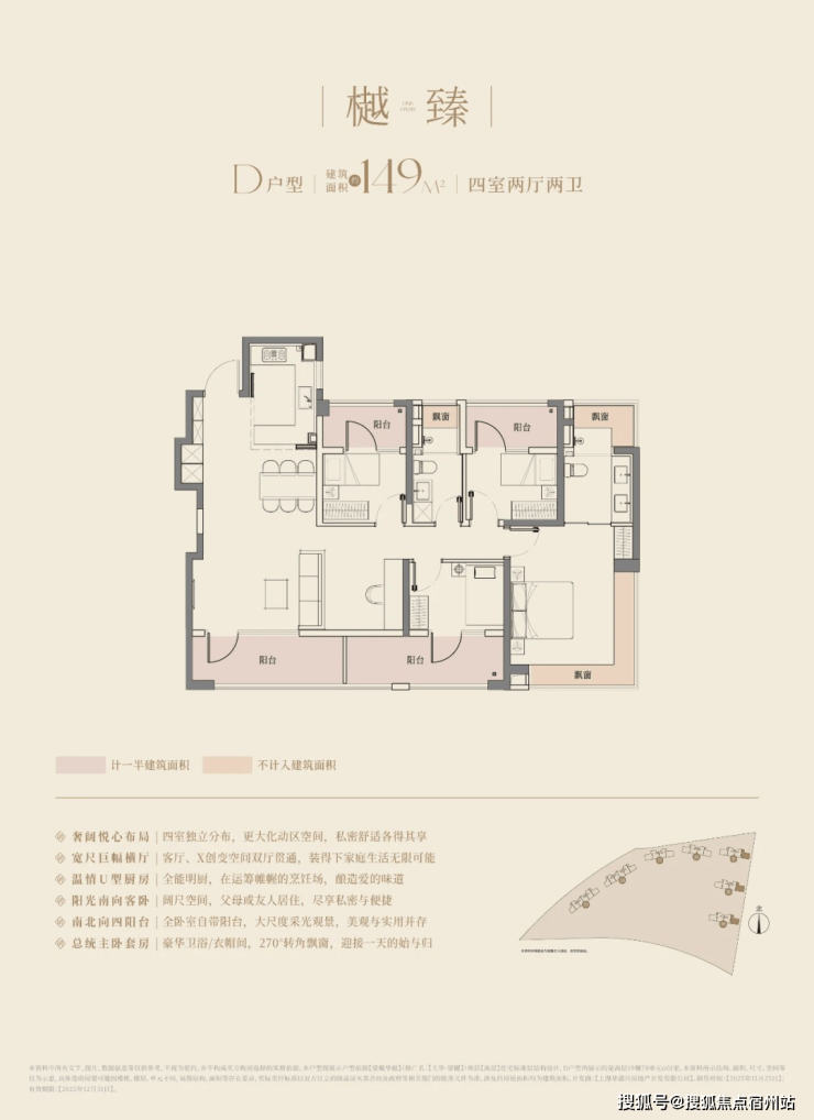 高层顶配,四阳台 + 双 270° 飘窗,赠送约 21.15㎡,使用率 95%,6 米横厅对标 160㎡大平层。