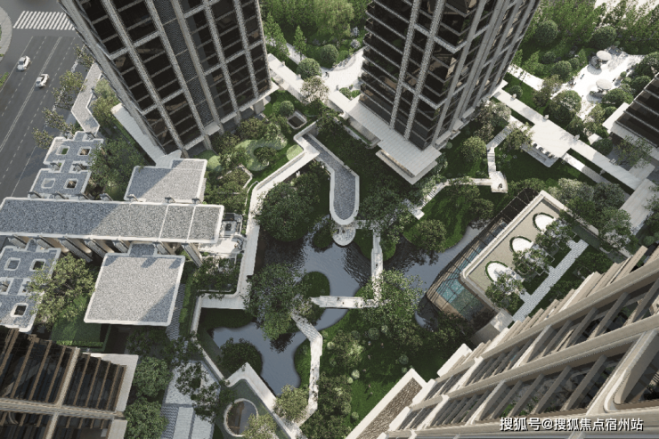 项目打造了约3万㎡立体景观与4000㎡全域架空层相互渗透的生态系统。中心是以约3500㎡下沉水院为核心,通过约6.5米全域架空与约6米下沉庭院叠合,塑造出落差近13米的“自然峡谷”,视觉冲击力震撼。
