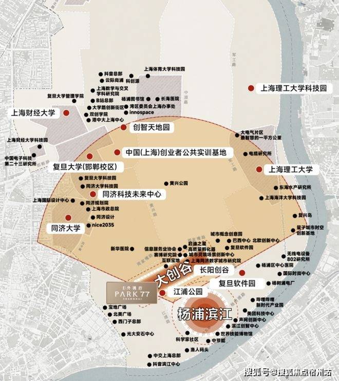 项目坐落于杨浦区长阳路与江浦路交汇处,身处 内环内杨浦滨江 CAZ 中央活动区核心腹地 ,与陆家嘴、北外滩共同构成 “外滩黄金三角”,这是上海城市发展的核心轴,也是资源最密集、价值最坚挺的区域。作为上海 “一江一河” 战略的重要承载地,杨浦滨江近年来以 “世界会客厅” 为定位,不断升级蜕变,从曾经的工业锈带变成如今的生活秀带、文化秀带,区域价值一路攀升,而启 PARK77,正是这片热土上的人居标杆。