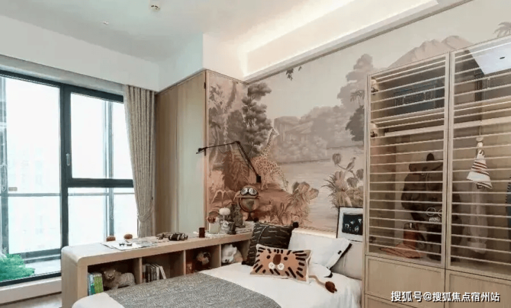 全屋墙布交付,公区木饰面、餐边柜一体化定制;