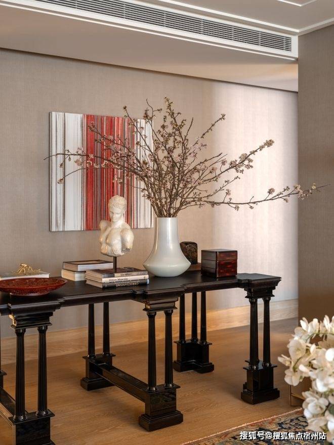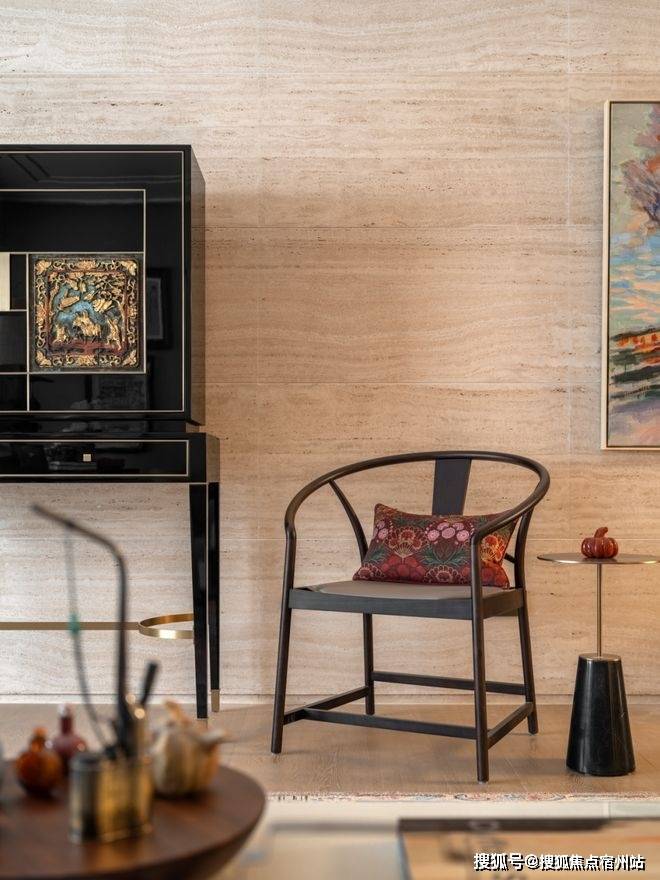 天潼里售楼处预约电话:400-8824-198融合焕新的高柜摆放于洞石墙前,哑光与纹路丰富的米白洞石衬托出了高光黑色烤漆的深邃与沉静。而嵌入柜面的中式楠木挂屏无疑是点睛之笔,采用朱红鎏金工艺对人物和图案进行着色,展现了传统与现代融合的可能性。天潼里售楼处预约电话:400-8824-198