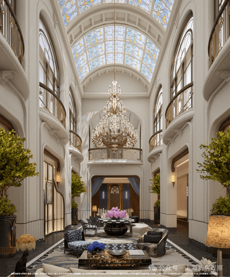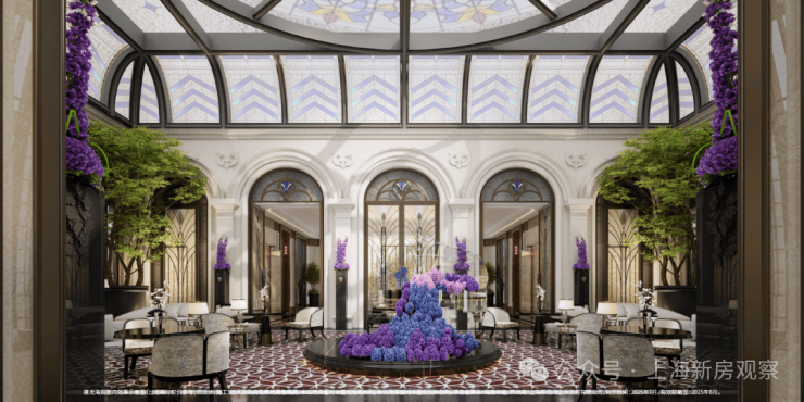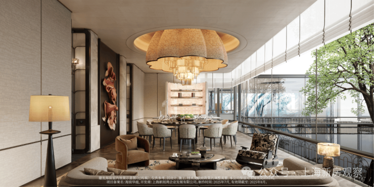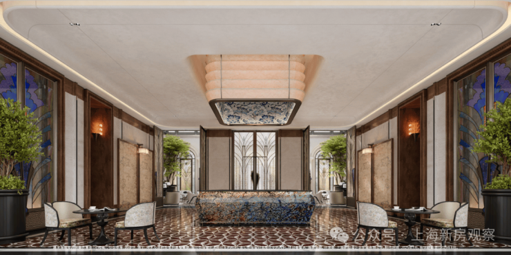 示范区以“玉兰门庭—迎归大堂—莳花荟”为核心轴线,运用非遗技艺与奢贵石材打造。约65米长玉兰门庭融合海派元素,9米挑高迎归大堂,汇集多位艺术家跨界作品,莳花荟中央会客厅再现海派社交场景。