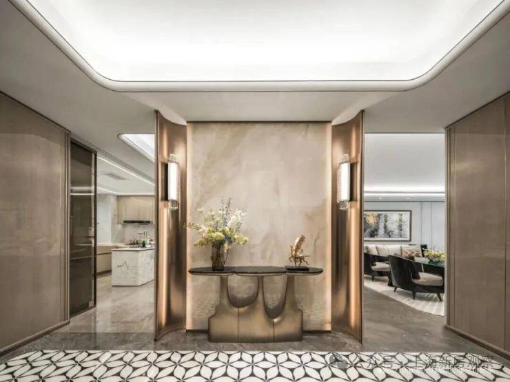「玉兰门庭」摩登飘逸,环抱式落客前场,大师定制非遗掐丝珐琅门钹,流转温润光华,敬呈归家尊崇礼序,自此启幕生活的华贵序章。