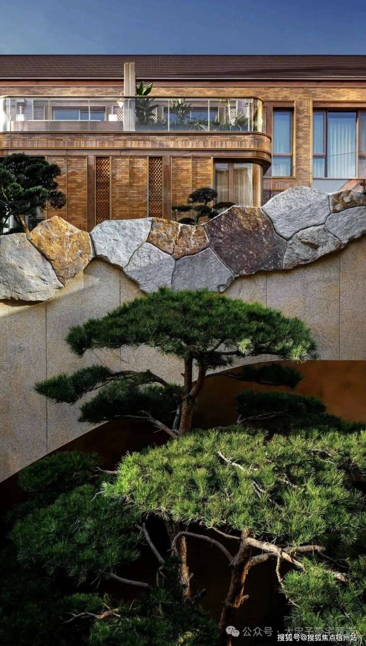 山水庭院汲取《足立美术馆》的造境手法,以老石皮、百年古木原样搬运,重现山间岁月的自然痕迹,与庭院中的光影交织,仿佛将山间的自然采光与静谧之感搬入城市。阳光透过树梢洒落,石皮上的纹理在光影中若隐若现,宛如一幅流动的自然山水画卷。