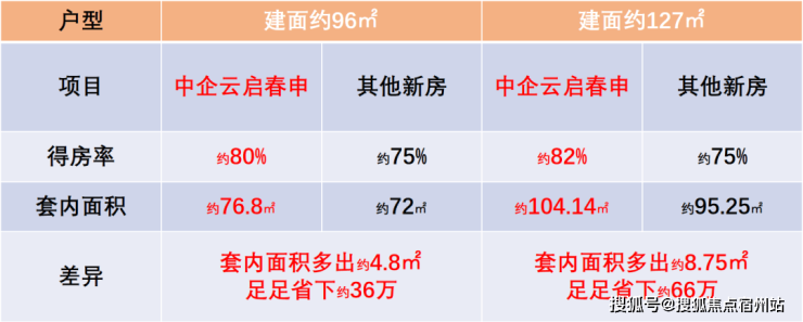 但 中企云启春申 的得房率却十分惊人:建面约96㎡3房的 得房率约80% ;