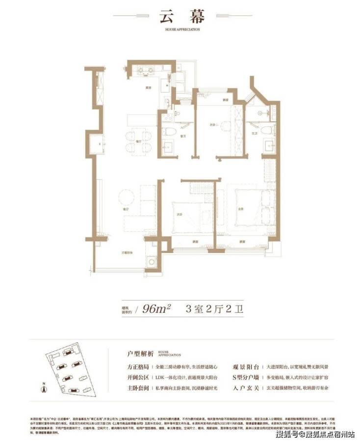 建面约96㎡3房2卫户型,三开间朝南,全卧室带飘窗。整个户型的采光、视野非常出众。