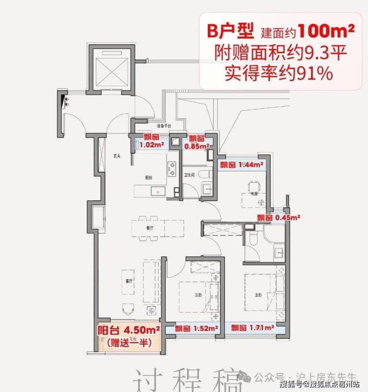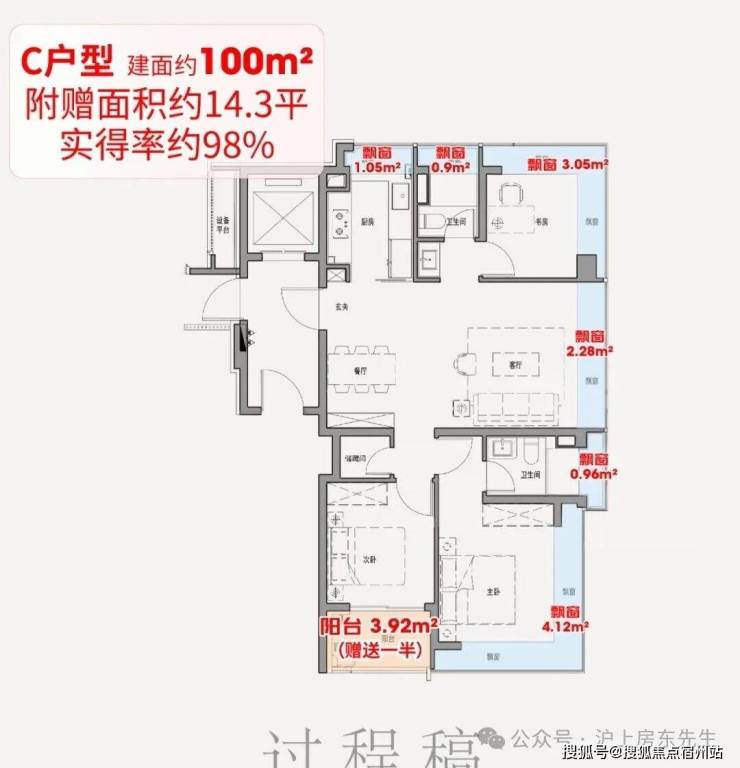 该户型满配6飘窗,比常规户型多2个卫生间飘窗、1个厨房飘窗;再加上阳台送一半面积,经过测算总赠送约9.3平,相当于一间次卧。