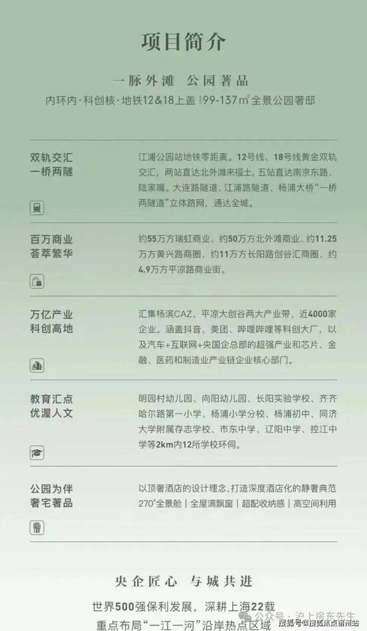 保利外滩启PARK77身处长阳路之上,向西望向大连路科创总部&豪宅集群,向东即为环江浦公园豪宅带。是这条黄金横轴上, 既能回望历史又能眺望未来的关键坐标 。