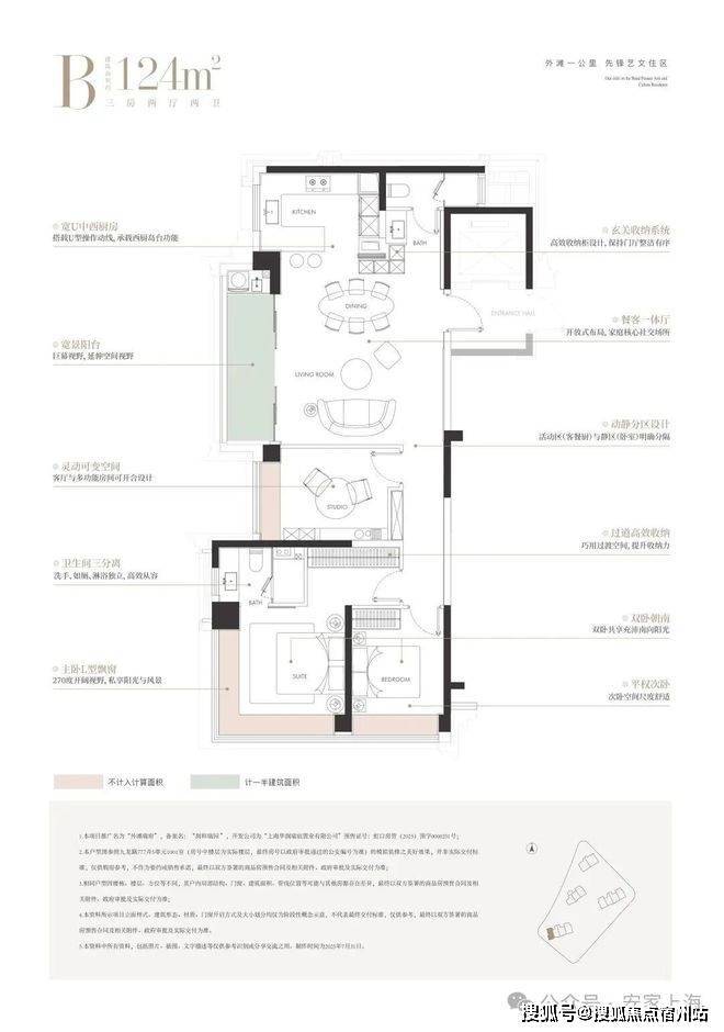 建面约124㎡的边厅“全景舱”户型,是外滩板块极致稀缺的臻品。它以三房布局满足主流家庭需求,更以无遮挡的视野与巨幕般的边厅落地窗,将城市天际线化为私藏画卷。主卧270°L型飘窗,让阳光与风景成为生活的主角。