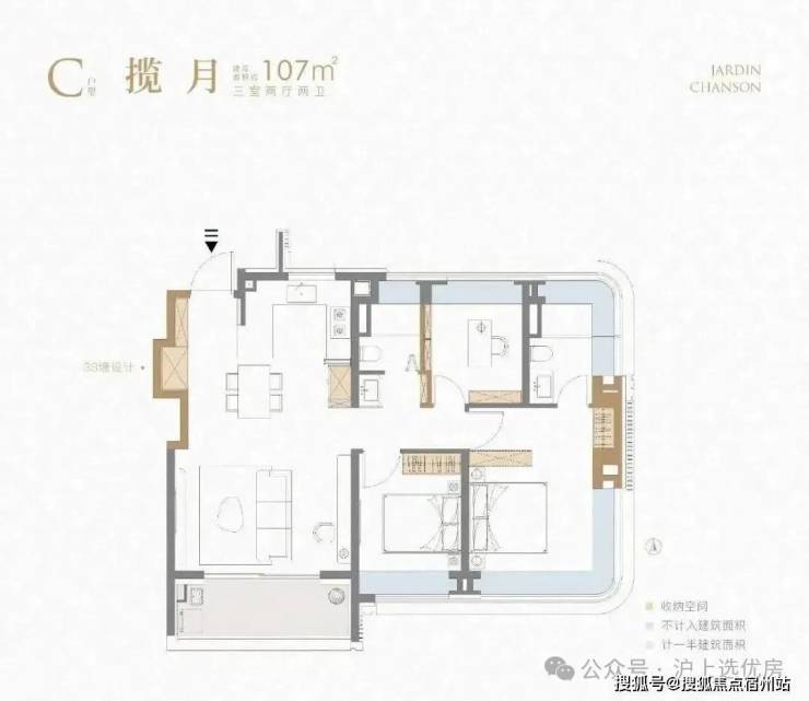 不到90㎡的建面实现3房一步到位,功能性上符合市场需求!同时利用科学的收纳和S墙设计保障了室内空间的井井有条,又通过大量飘窗和阳台等提升尺度感,尤其是厨房带飘窗你见过吗?②建面约107㎡3房2厅2卫户型: