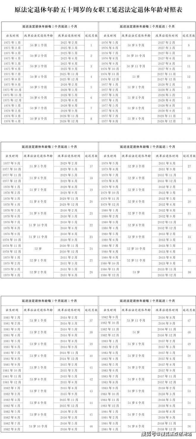 2025年1月1日起,原法定退休年龄为60周岁的男职工和原法定退休年龄为55周岁管理、技术岗位的女职工,法定退休年龄每四个月延迟一个月,分别逐步延迟至63周岁和58周岁;原法定退休年龄为50周岁工人岗位的女职工(不包括事业单位在编的干部身份的女职工),法定退休年龄每二个月延迟一个月,逐步延迟至55周岁。