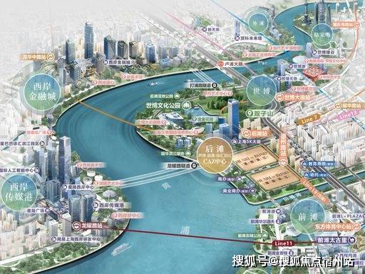 项目精准占位世博文化区、前滩国际商务区、徐汇滨江三大城市核心板块构成的 “新黄金三角” 几何中心,与各板块直线距离仅约800 米,天生坐拥三大高能级板块的资源红利辐射。向北,承接世博文化公园 200 万㎡生态与艺术配套;向南,直抵前滩太古里、晶耀前滩等国际商业集群;向西,隔江对望徐汇滨江的艺术氛围与总部经济,形成 “10 分钟生活圈” 覆盖商务、商业、生态、文化全维度资源的核心格局。