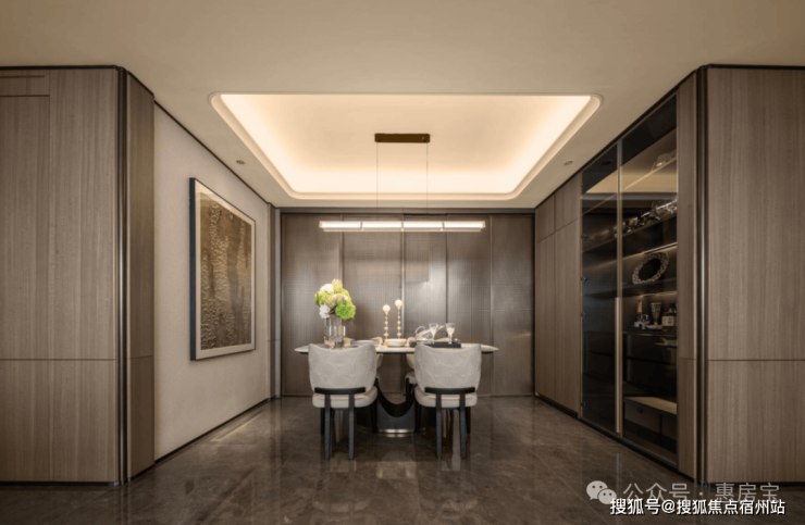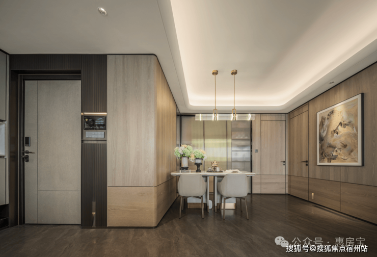 有一个细节大家可以在实地看样板间时留意: 交付的内嵌式冰箱面板也是采用了木饰面 ,高级感扑面而来! 吊顶和墙面采用
