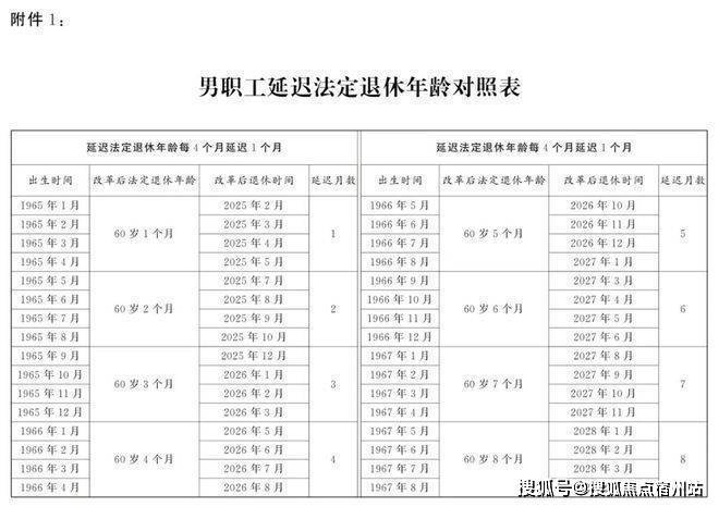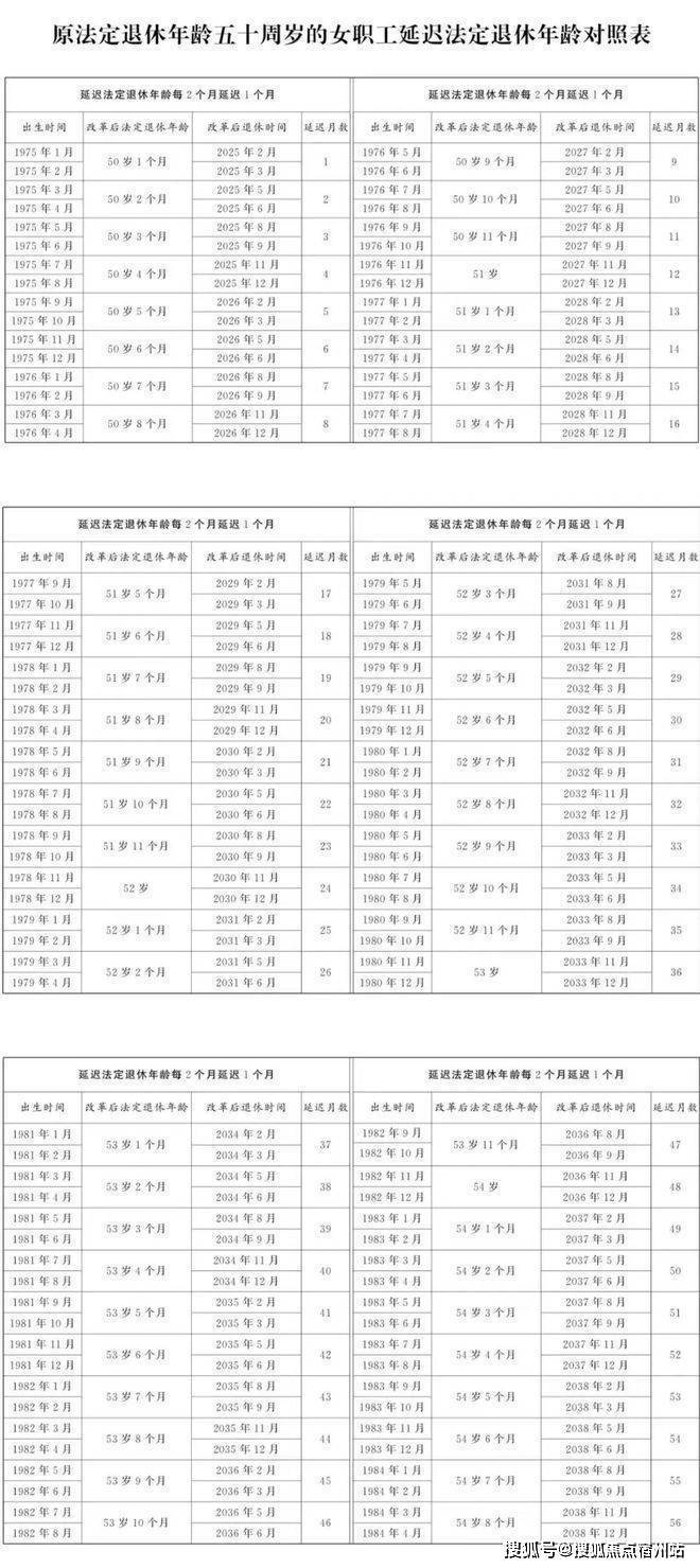 2025年1月1日起,原法定退休年龄为60周岁的男职工和原法定退休年龄为55周岁管理、技术岗位的女职工,法定退休年龄每四个月延迟一个月,分别逐步延迟至63周岁和58周岁;原法定退休年龄为50周岁工人岗位的女职工(不包括事业单位在编的干部身份的女职工),法定退休年龄每二个月延迟一个月,逐步延迟至55周岁。