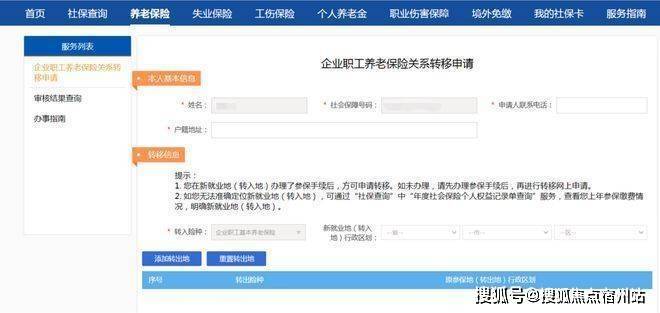 第二步:在左侧功能栏中,选择“企业职工养老保险关系转移申请”,进入办理页面。
