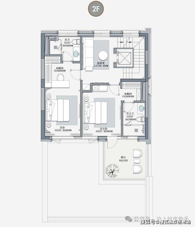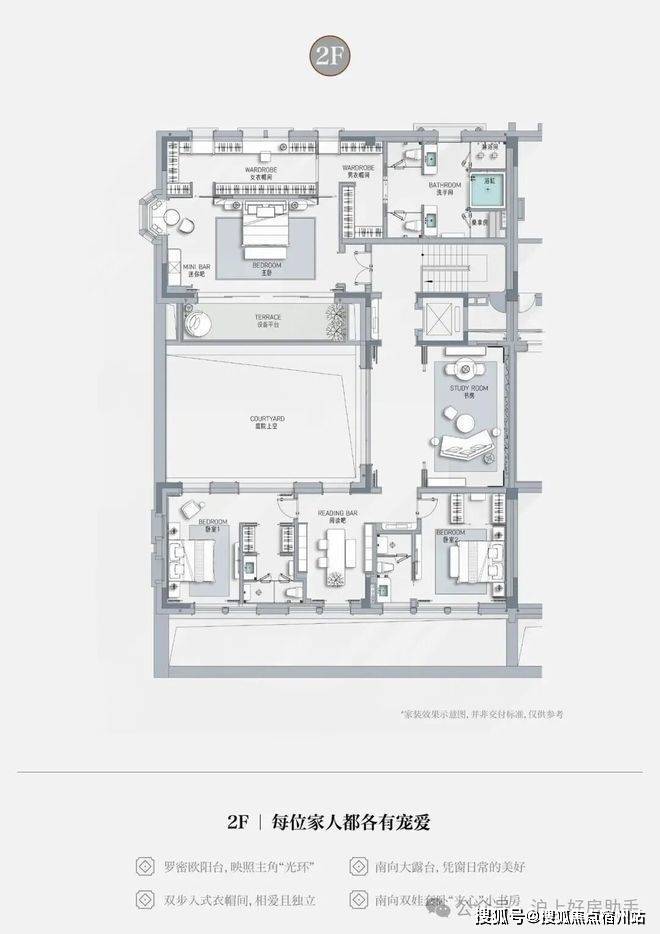 客厅互通,彰显家族生活的轩阔厅堂,2F家庭层,儿女的幸福与陪伴皆在左右,3F总裁套房式Penthouse,用具象的尺度描写人生成就的高度。