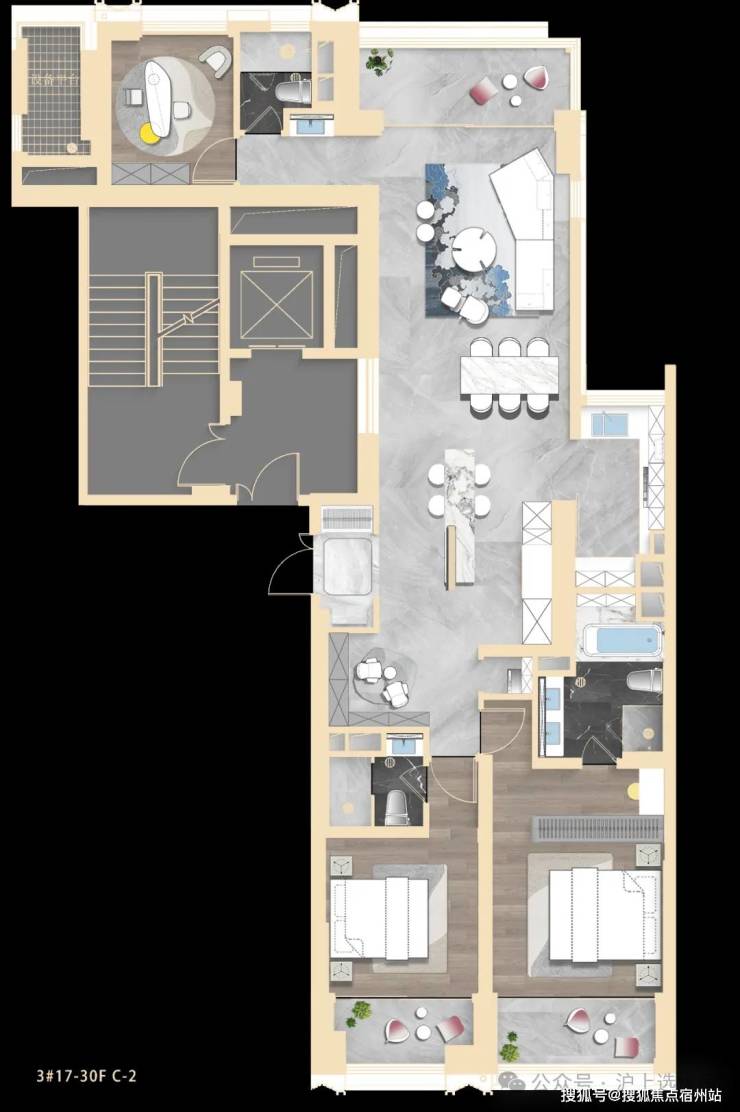 尤其 主卧星级套房 ,配置独立衣帽间、书房,奢华主卫四分离,双台盆+淋浴区+大浴缸+智能马桶,私密性&奢适度无敌;