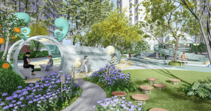项目打造约1.8超低容积率和约35%绿化率,静享舒朗自然;约7000㎡中轴景观,涵盖约3000㎡多功能中央草坪和约200米景观长廊,日常簇拥花间草木,让建筑与绿意和谐生长。