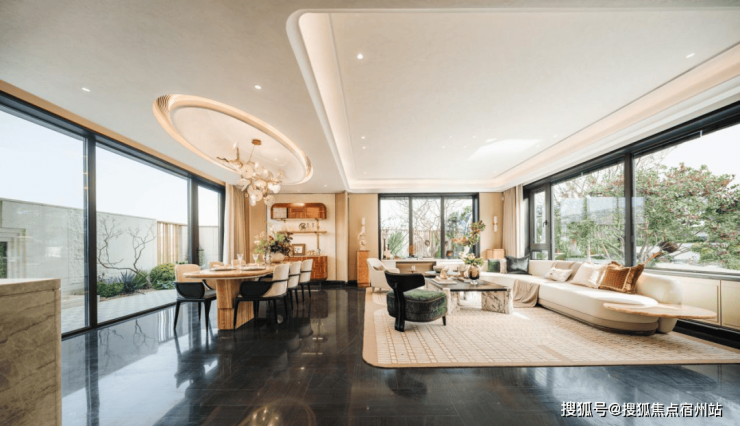 首层庭院、餐、客厅三重场景融合设计,超10米开间比肩大平层的面宽尺度,270°光感宽厅,三面环幕采光所带来的视觉震撼,就已断层领先于市场同类墅居产品;室内餐客一体分区,南北双向延展室内外景观;配享约6米室内挑空,营造出开阔大气的社交氛围,让仪式感与功能延兼具。