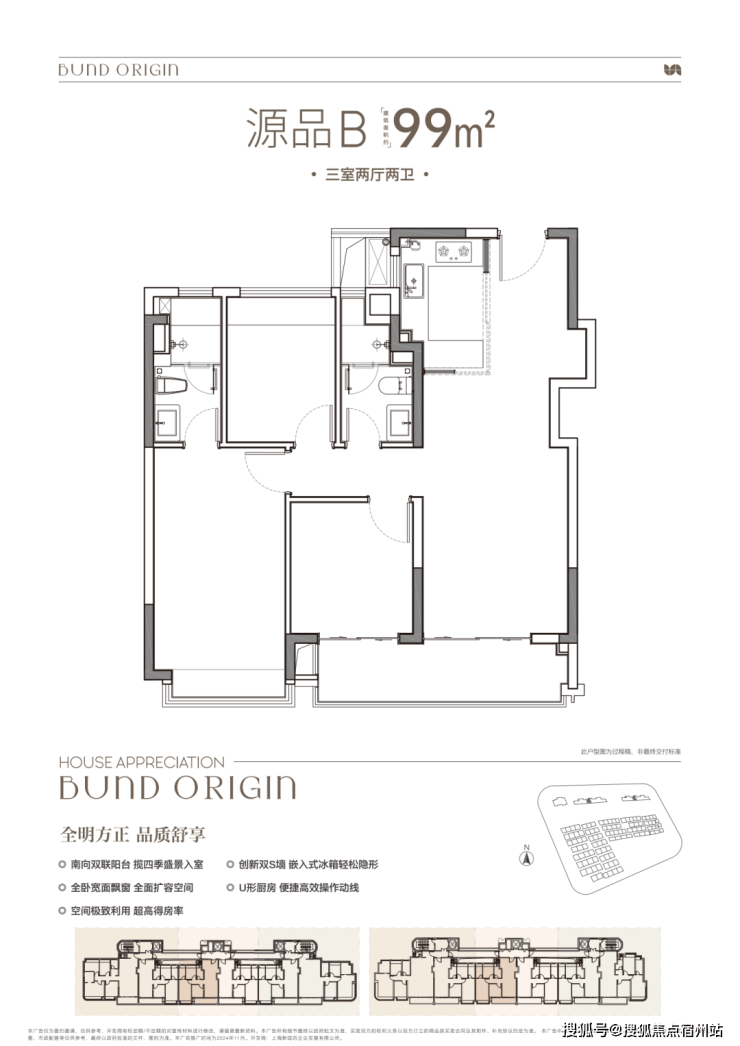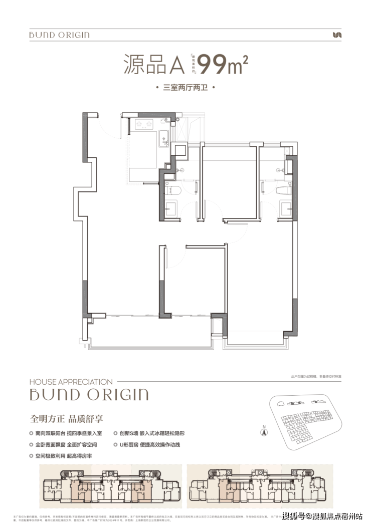 建面约99㎡3房2厅2卫,非常标准的动静分离、三开间朝南户型。 "分户s墙"设计在分户墙处增设“凹型空间",“冰箱外移"增加厨房操作台面和收纳空间,创造更合理的餐厨桌台动线。 三开间朝南+南向双阳台设计+全卧室带飘窗,为整个户型带去非常出色的采光,同时室内视野的延展性很强。动静分离则是把功能区与休息区分割,加上主卧套房的设计,让业主有更好的私密性和生活舒适度。