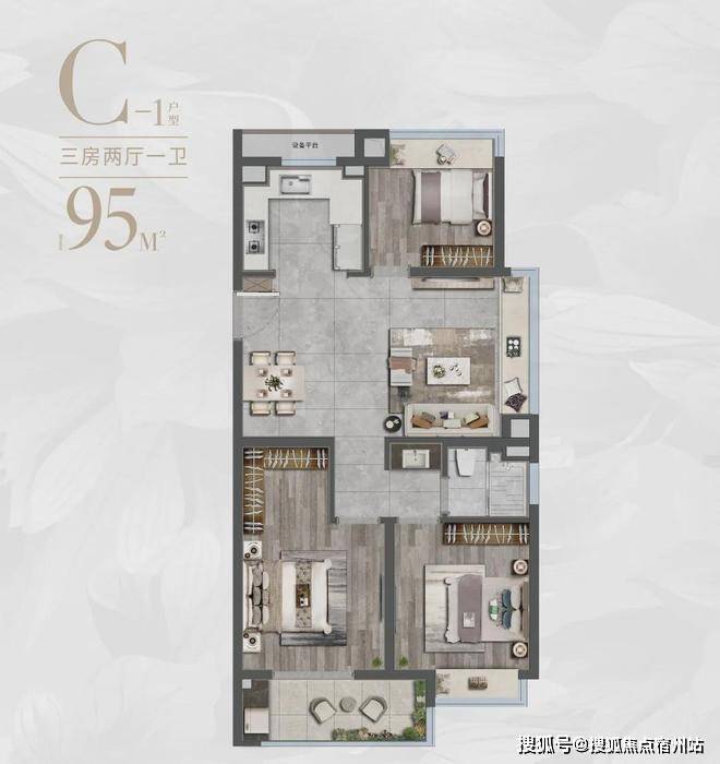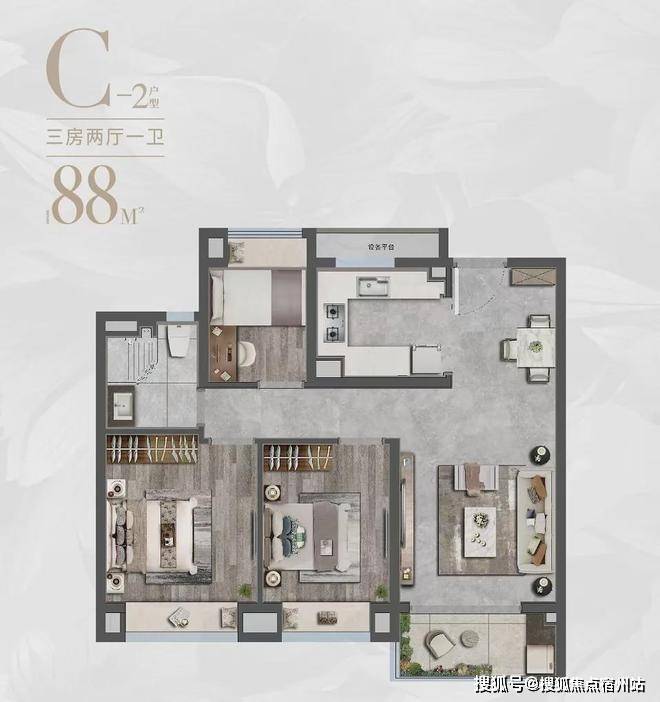 约88㎡三房:采用三开间朝南设计,主次卧附带飘窗,延展空间视野。得房率约78%,在高层住宅中表现不错。