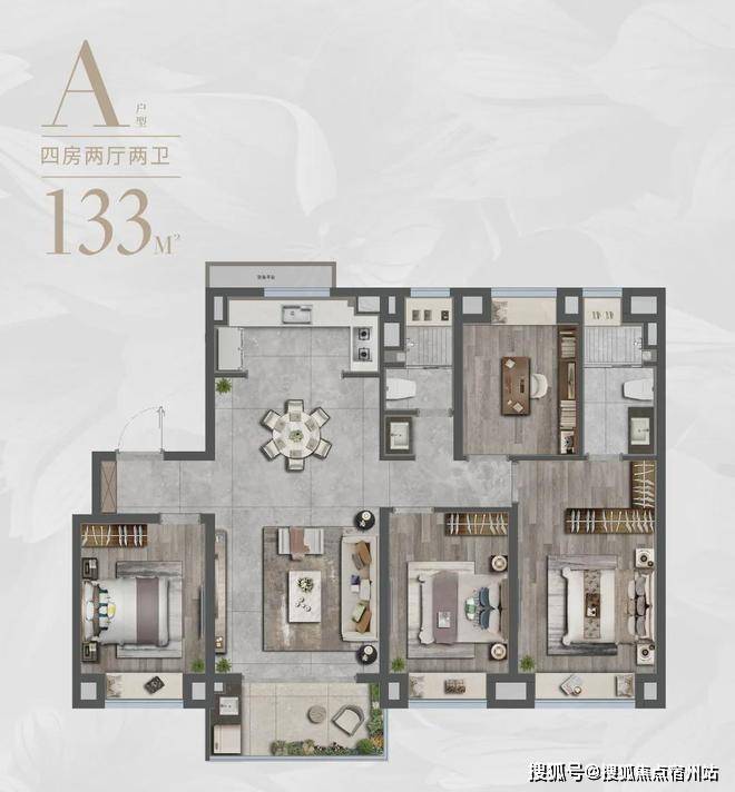 约133㎡四房:四间朝南,三卧一厅朝南,开放式U型厨房,客厅及餐厅独立分开。✅安联虹悦售楼处电话:400-8854-706✅︎✅︎
