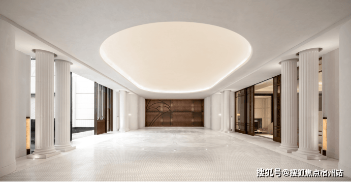 在门庭的环岛空间,景墙面采用中轴对称的设计布局,定制了奢石镶嵌装饰,将曲面艺术与经典石器之美圆融交融。