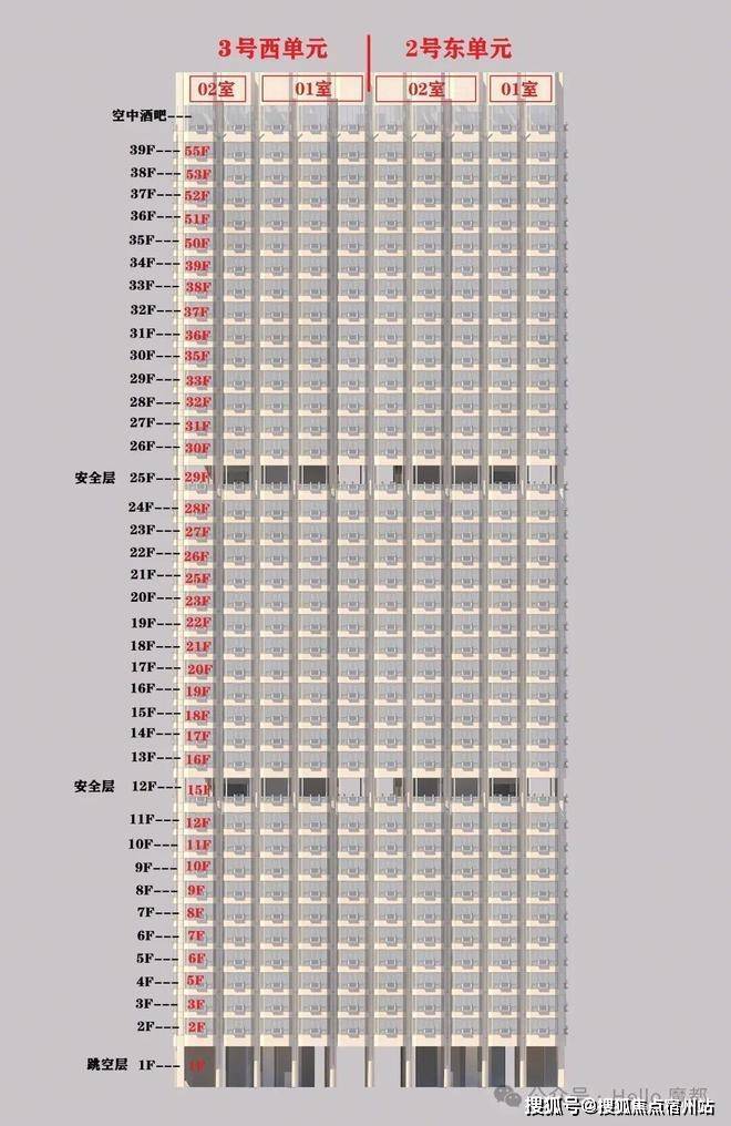 2号楼情况:总高160米共39层,108套,其中有3层避难层(实际12F,25F,40F),36层是住宅,分2个单元,两边是复式619平36套(2单元01室、3单元02室),中间是平层363平72套(2单元02室和3单元01室)。3号楼待建。1号楼14层以上均可看黄浦江和陆家嘴三件套,2号楼30楼以上也都能看到。