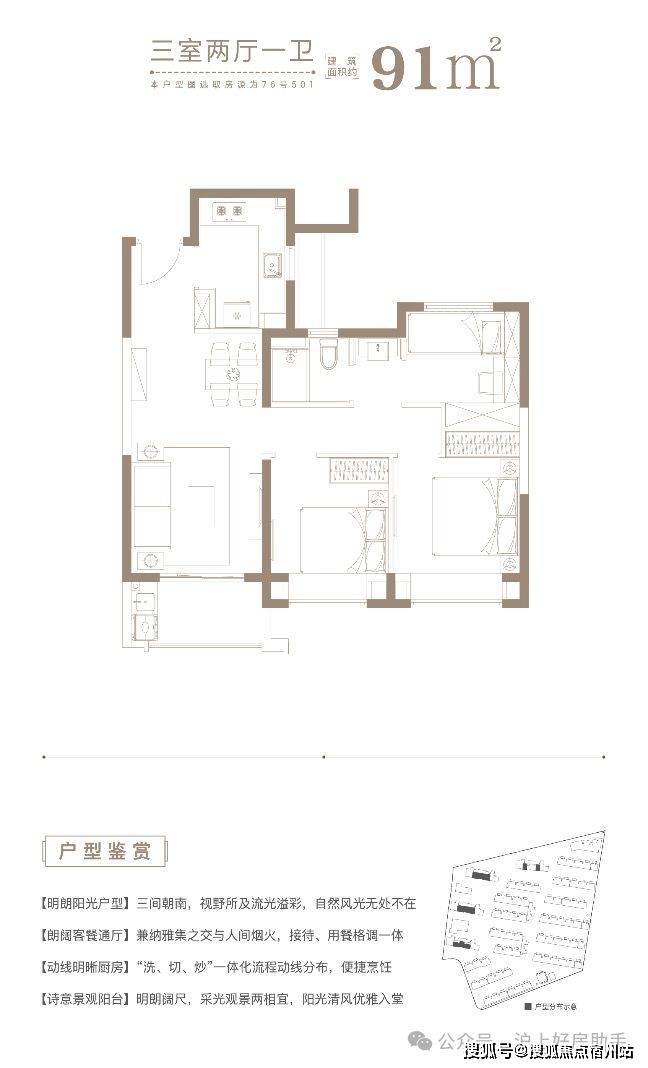 户型解析:三开间朝南+双朝南卧室带飘窗+动静分离+卫生间干湿分离,这样的三房设计,对于上海首套置业购房者来说,非常友好,未来想要做置换,也比较容易出手。