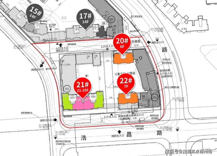 20#、22#总高6-7F,首层为商业,户型为建面约89㎡3房2厅2卫,一梯两户,层高约3.05米;