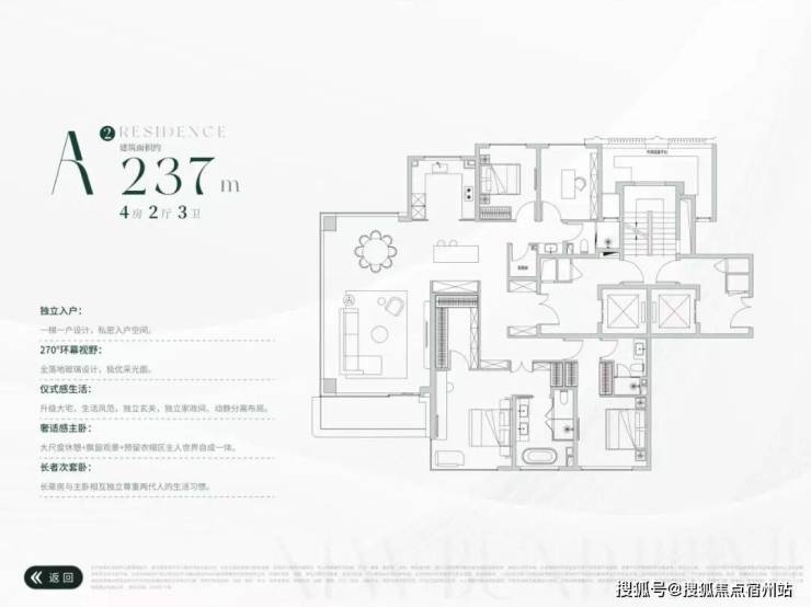 10#总高13F,户型为建面约199-236㎡4房2厅3卫,两梯两户,层高约3.15米。