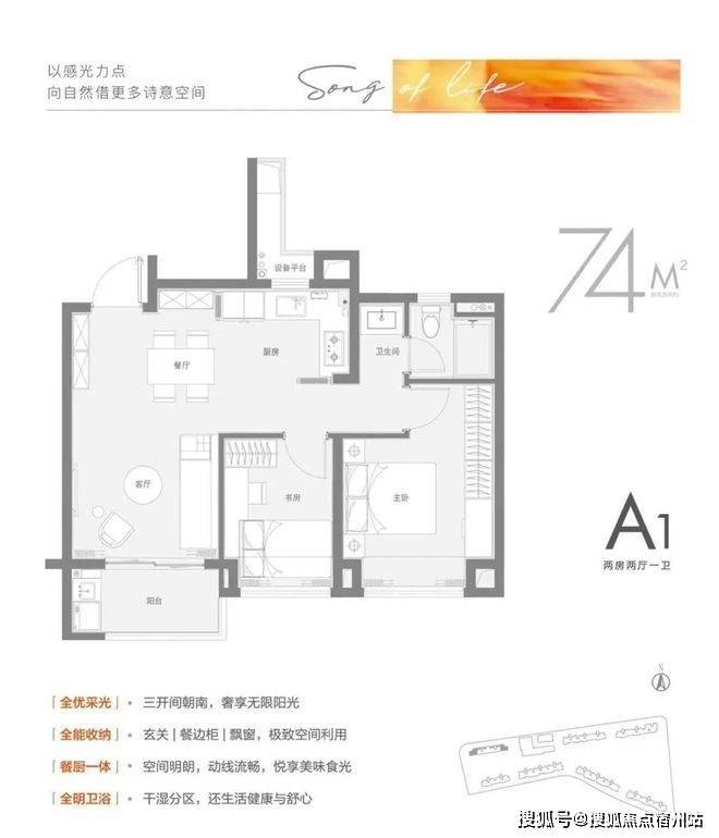 建面约74㎡2房竟做到三开间朝南,其中两卧均朝南,✅✅保利虹桥和颂售楼处电话:400 - 882 - 4258✅✅同时面宽甚至大于进深,这比同类产品卧室一南一北狭长布局要舒适得多。