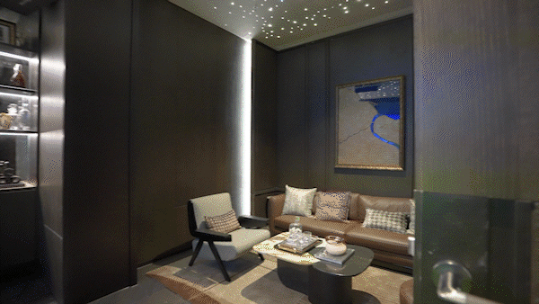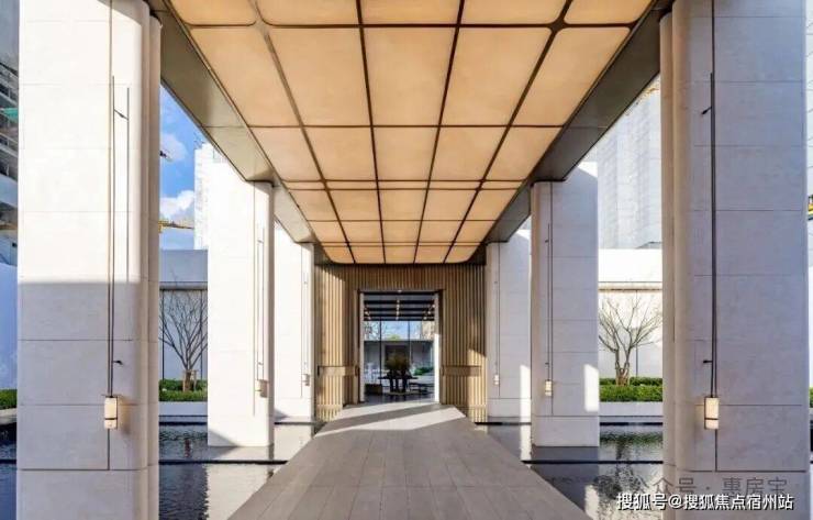 通过迎宾楼,便来到了 约20米长的精神游廊, 该精神游廊同源招商玺“树宅相守”的设计手法,更致敬建筑诗人斯卡帕“以自然光感去创造时间驻留感”的理念,通过对光线、材质与空间的创新打造,营造充满宁静的归家场域。
