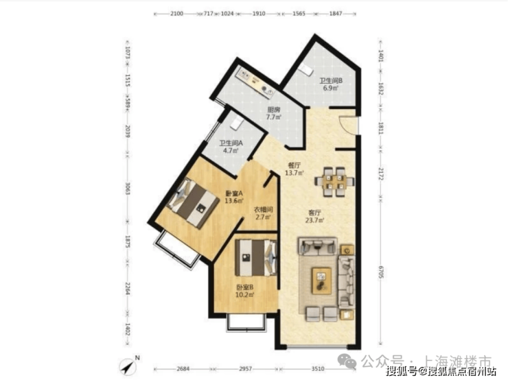 ③ 全朝南:客厅,2卧室,整体朝南,阳光好