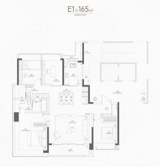 来到165㎡个户型,已经上升到上海主流的大户型改善面积段,但看设计思路,可以看出是为满足多胎家庭成长而服务的。