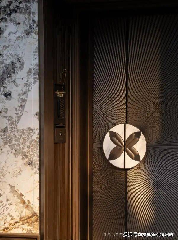 比如入户门选用了 定制化的仿铜铸铝门, 嵌入普拉达绿奢石中 古铜色门牌号, 高级酒店般的质感营造的非常细腻。