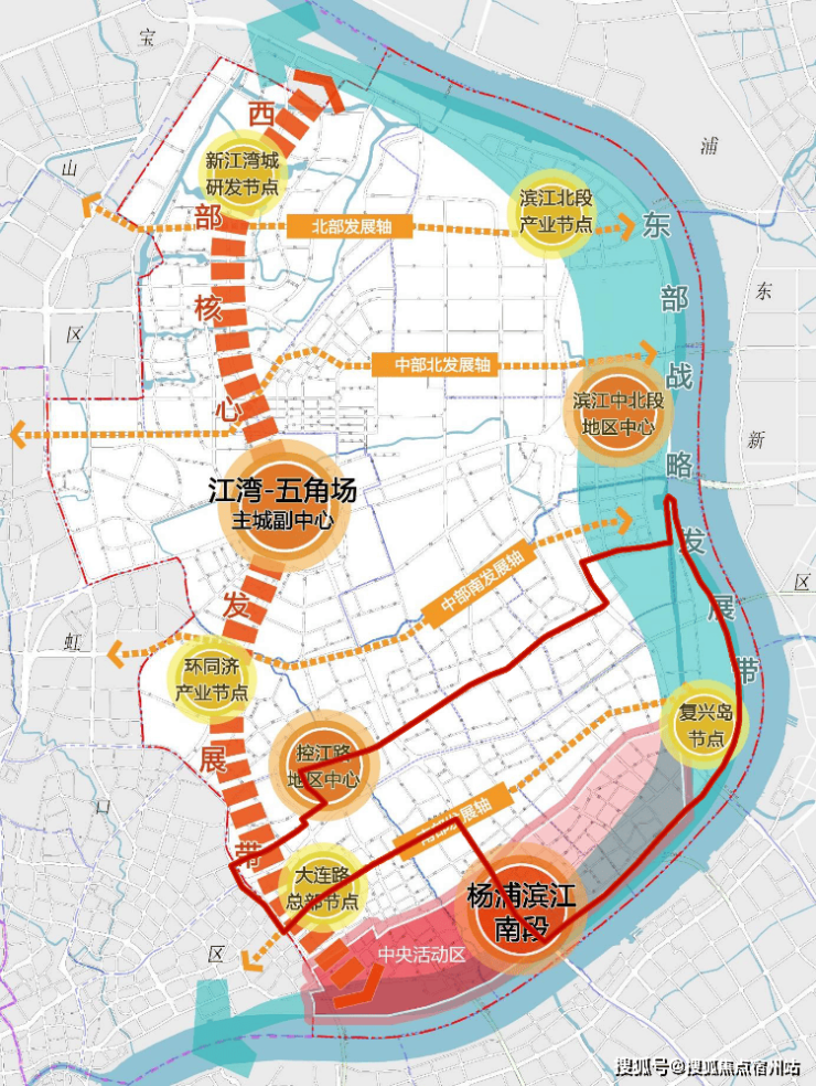 杨浦区2035规划为这片区域描绘了一幅宏伟的蓝图。为了加速实现 “东西携手并进,南北互动发展”的战略目标,通过优化空间布局,促进功能区域的联动与融合,规划构建了一个以 “一核引领,三心聚力,两带贯穿,四轴联动”为特色的总体空间架构。而周家嘴板块正位于南部发展轴的核心位置,与东部战略发展带紧密相连。
