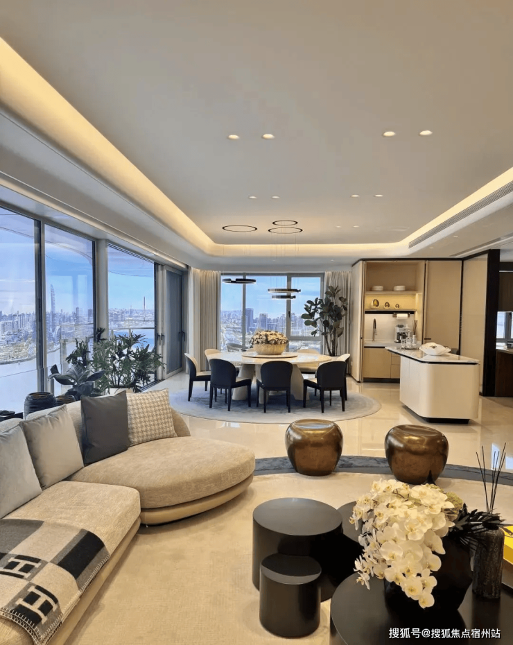 空间尺度阔绰,无浪费面积,全屋精装采用天然石材、实木地板、高端皮革等材质,手工打磨细节,搭配智能家电系统、全屋净水、中央空调、地暖等顶配设施,兼顾美观与实用,实现 “一步到位” 的改善理想。