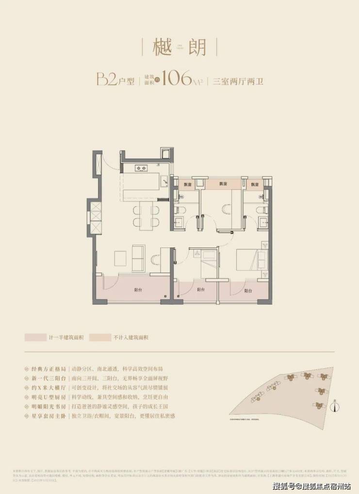 经典动静分离户型,预留分户“S”墙设计,三开间朝南+双阳台,阳台合仅计算一半建筑面积,主卧以及主卫附赠270°转角飘窗;