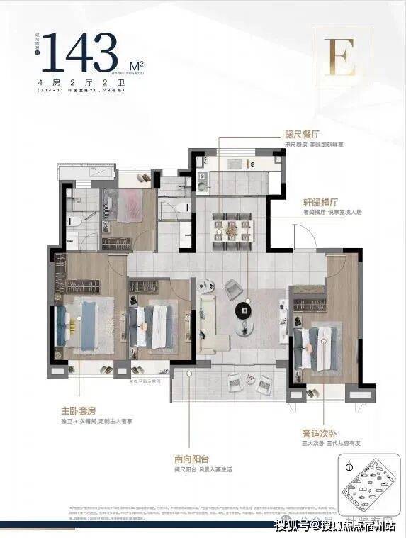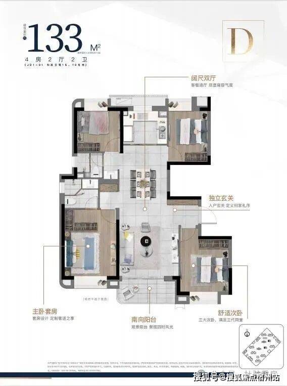 建筑面积约133㎡/143㎡四房两厅两卫, 大开间,在满足空间感的基础上,增加户型的功能性,承载生活高舒适度;其中建筑面积约133㎡的四叶草户型,主卧套房设计,三代同堂各有私密天地;南向观景阳台,饱览阳光美景,双卫设计,提供更多私密空间与生活便利。