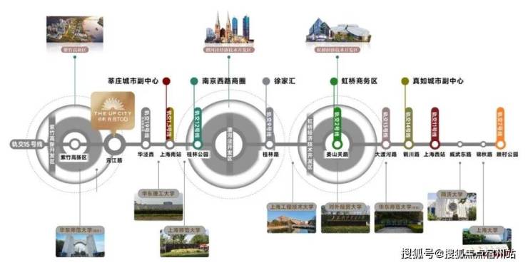 15号线为贯穿南北的交通大动脉,5站即达徐汇,并串联了 3个国家产业园 (紫竹高新区、漕河泾经济技术开发区、虹桥经济技术开发区)、 9大高校 (华东师范大学中山北路校区、华东师范大学闵行校区、上海交通大学闵行校区、华东理工大学徐汇校区、上海对外经贸大学古北校区、上海大学宝山校区等)、 2大火车站 (上海南站、上海西站)、 4大公园 (顾村公园、长风公园、桂林公园、上海植物园),形成产学研联动走廊,并可与 11条轨道换乘,高效链接全城,轻松出行、便捷通勤。