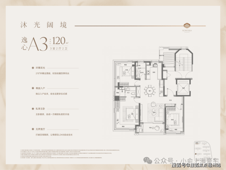 约120㎡的3房户型, 全屋飘窗赠送(实得率超82%)+ 类一梯一户(4#、6#楼配置)+ 270°双卧转角窗(边套户型)+ 飞机户型南北通透+ 约10.8-11.2米大面宽三开间朝南,尺度感拉满,而且设备平台精心设计,不遮挡北侧视线。