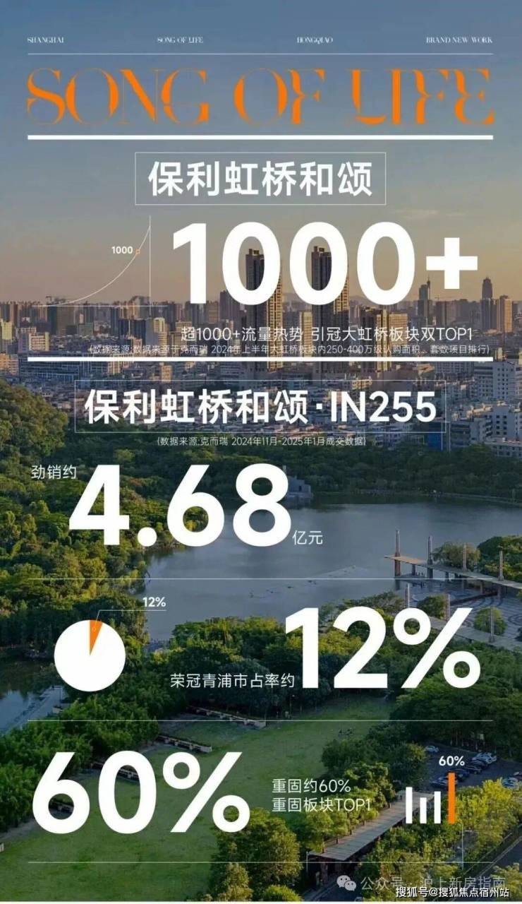 【保利虹桥和颂】以开篇者之姿,一举打破板块沉寂,凭借10000+人次现象级到访流量实力出位。继首作破局,战略纵深再落关键一子,【保利虹桥和颂·IN255】首开即强势斩获4.68亿元业绩,更以单盘青浦约12%、重固板块约60%市占率,给出了城市立新的标准答案。(数据来源:克而瑞2024年11月﹣2025年1月成交数据)