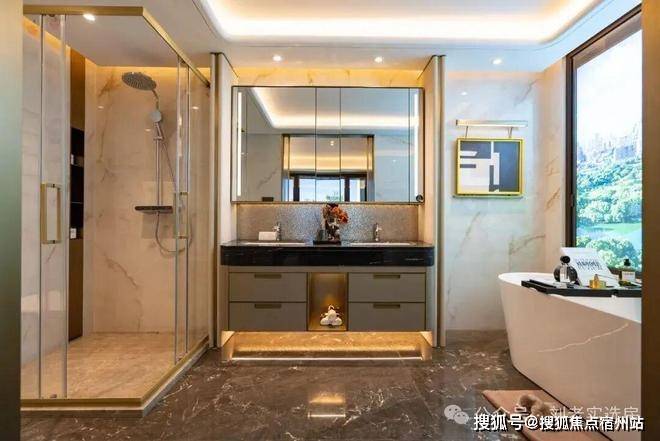 【江湾鸿玺】售楼处预约咨询热线:400-882-4198主卧以豪华套间标准打造,配备独立步入式衣帽间以及双台盆,淋浴区/浴缸双沐浴方式,实用性与豪华兼备。