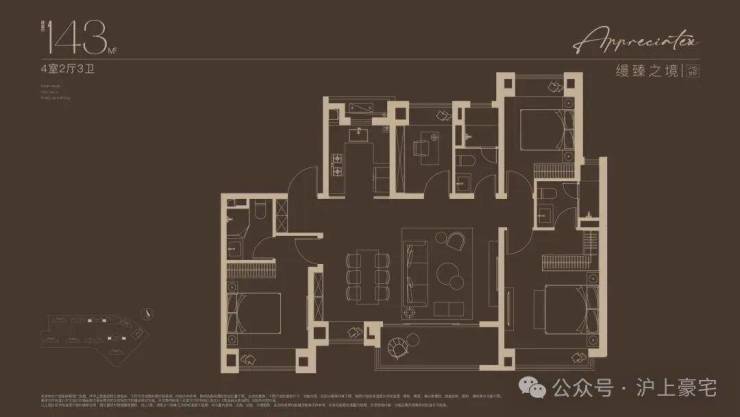 建面约143㎡四房设计,不论是三代同堂还是二娃家庭,都舒居无忧!2梯2户的设计, 极具私密性的入户门厅,彰显大宅归家礼序 。独立玄关,既是归家仪式感,更添收纳空间;约14米朝南面宽,搭配约7米尺度横厅 ,尽显大宅风范;东西双套房设计,奢享全龄世家的静谧时光。